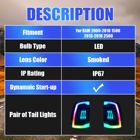 Transforma la parte trasera de tu Ram con el conjunto de luces traseras de alto rendimiento PrismBeam , diseñado para Dodge Ram 1500 (2009-2018) y Ram 2500/3500 (2013-2018). Disponible en un llamativo Rojo Ahumado o con acabados digitales RGB totalmente personalizables para realzar el estilo y la visibilidad.